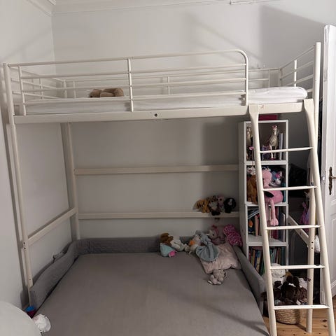 IKEA højseng til børn. Sengen er udført i træ og har en integreret stige op til liggefladen. Under sengen er der et åbent område, som kan bruges til opbevaring, leg eller som lille hule. Sengen har sengehest hele vejen rundt for øget sikkerhed. Gardiner under sengen kan trækkes for, så området delvist kan afskærmes. Velegnet til børneværelse, hvor man ønsker ekstra gulvplads under sengen.
