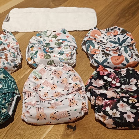 7 genanvendelige bleer fra Alva Baby passer fra 0-24 måneder, fyldt med enten polyester eller bamboo indlæg.