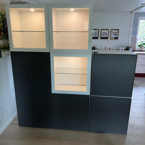 IKEA Bestå vitrineskab. Skabet har gode, dybe skuffer i bunden, med god plads til opbevaring. Skabet skal afhentes fra 2. sal, men der er elevator i bygningen.
