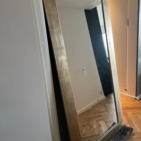 Stort rektangulært spejl med guldfarvet ramme.