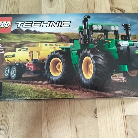 LEGO Technic traktor med tilkoblet redskab. Modellen er bygget af Technic-elementer med store dæk, ratstyring og bagmonteret redskab med tandhjul. Egnet som byggesæt til leg eller som supplement til andre LEGO Technic modeller.
