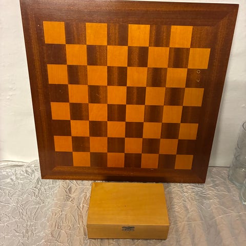 Skakspil med foldbart træbræt og komplette skakbrikker. Brættet er udført i to nuancer træ med markerede felter og koordinater langs kanten. Brikkerne er i lyse og mørke nuancer og er opstillet til standard skak. Brættet kan klappes sammen for nem opbevaring og transport. Velegnet til almindeligt skakspil i hjemmet eller på farten.