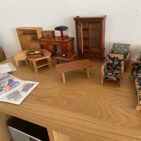 Dukkehus møbelsæt stue træ grøn polstring