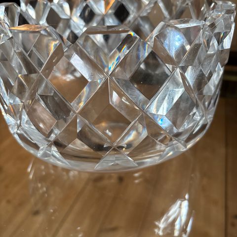 Meget stor og smuk Krystalskål på fod i klart glas med facetslebet mønster. Skålen har rund form og står på en kvadratisk fod med stjernemønster i bunden. Velegnet som dekorationsskål, til servering eller som bordpynt i hjemmet.