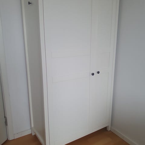 2 skuffer i bunden. Den ene side er der en knagerække og den anden side kan der sættes 3 hylder op, hylderne følger med.