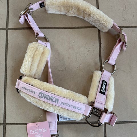 Eskadron Performance grime med lammeskind i navy. Grimen har blød, lys kunstlammeskindspolstring på nakke-, næse- og sidestykker for øget komfort. Justerbare remme og metalspænder.