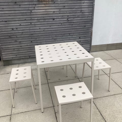 Ronan og Erwan Bouroullec for HAY. Havebord med stel af pulverlakeret stål i farven Anthracite. H. 74 cm. L. 190 cm. D. 87 cm. Samt seks havestole H. 81 cm. L. 51,5 cm. D. 52 cm. SH. 46 cm. Model Balcony. Fremstillet hos HAY