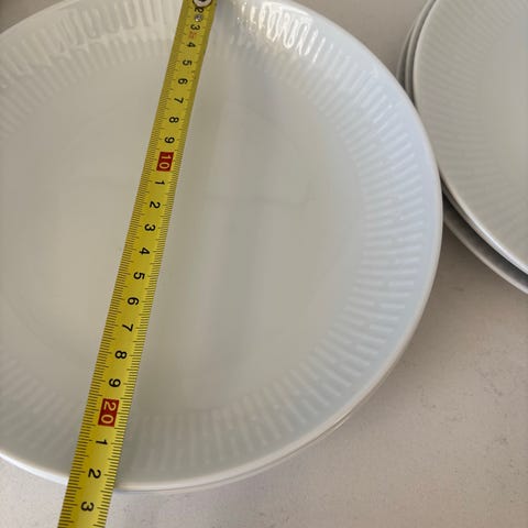 &Tradition rektangulære tallerkener i hvidt porcelæn. Tallerkenerne er aflange med let buede kanter. På billederne ses målebånd, der angiver cirka længde og bredde på tallerkenerne. Egner sig til servering af forretter, desserter eller anretninger ved borddækning. Designet er enkelt og neutralt, så tallerkenerne kan kombineres med andet service i lignende stil.