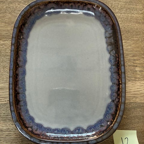 Retro retangulær serveringsfad / ovnfast fad i stentøj fra B&G fra stellet Mexico, som er dekoreret med marmoreret glasur, i brune, lilla og blå farver, så det ser ud til kanten er brændt og hvor glasuren “løber”. Design af Jens Harald Quistgaard. 1. sortering.