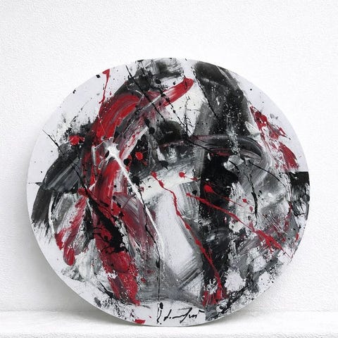 Værk af Isak Friborg med motiv af skakbrikker på et abstrakt bagtæppe. Maleriet viser flere skakbrikker i forgrunden og en landskabslignende baggrund med mørk himmel.