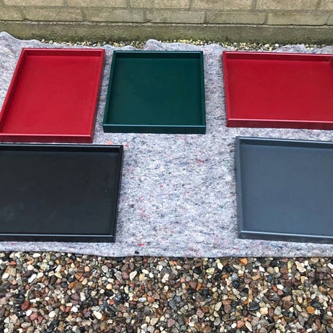Fem løse Montana bakker, der er lavet til bakkeindtag/skuffer på moduler, men som også kan bruges som serveringsbakker m.m.