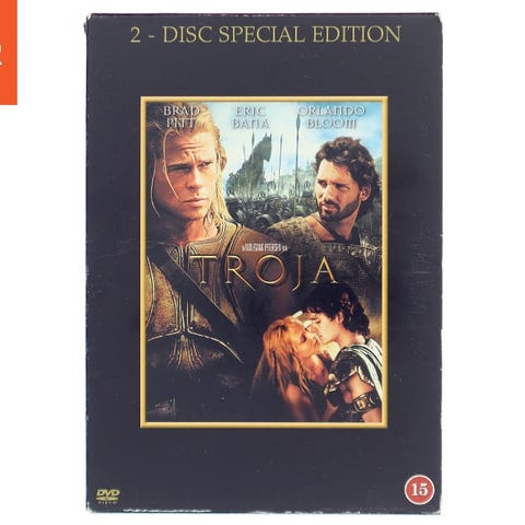 En DVD af filmen 'Troja', en berømt historisk actionfilm fra 2004, instrueret af Wolfgang Petersen. DVD'en er på dansk, inkluderer to diske fyldt med ekstra materiale og har en spilletid på cirka 156 minutter. Coveret viser hovedskuespillerne og væsentlige scener fra filmen.