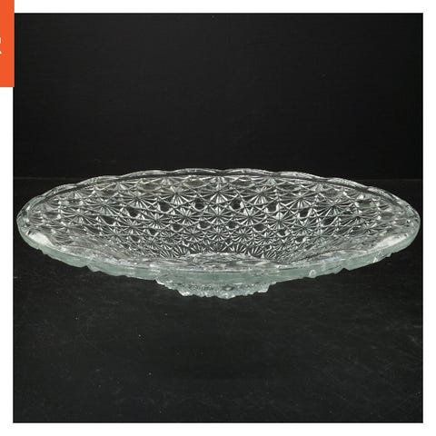 Dette er et klart glasfad med indgraverede mønstre. Fadet har en oval form og måler 26 cm i længden. Det er ideelt til servering og dekoration.