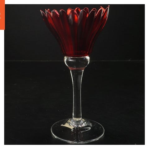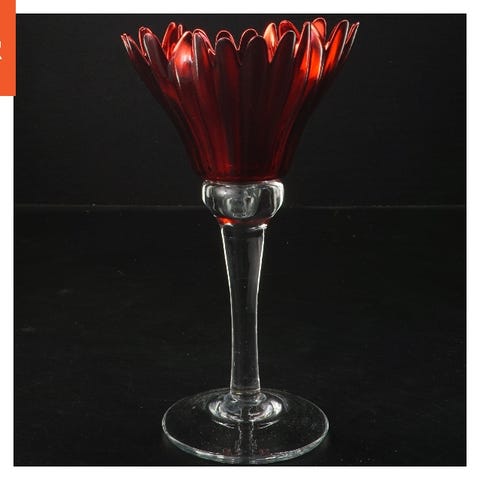Dette objekt er en elegant glas vase med en fod. Vasen er lavet af klart og rødt glas, hvor den røde del danner en flot blomsterformet åbning foroven. Foden er klar og cylindrisk med en stabil rund bund. Objektet har en størrelse på 11x20 cm. Vasen kan bruges til dekoration eller til at holde små blomsterarrangementer.