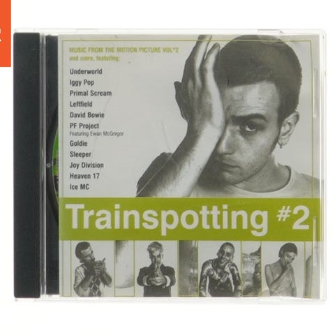 CD udgave af 'Trainspotting #2' soundtrack med musik fra den kendte film. Designet på cd'et er i grøn og sort, og coveret indeholder billeder og tekst. Tracklisten inkluderer kunstnere som Underworld, Iggy Pop, Primal Scream, Leftfield, David Bowie, og mange flere.
