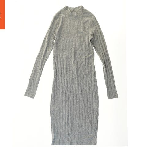 Langærmet kjole i grå farve. Kjolen har en højt halskrave og er ribbet. Den falder til omkring knæet og har en enkel, strømlinet design.