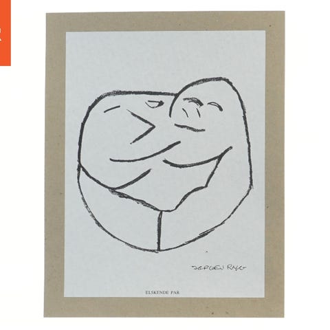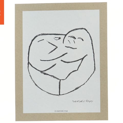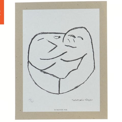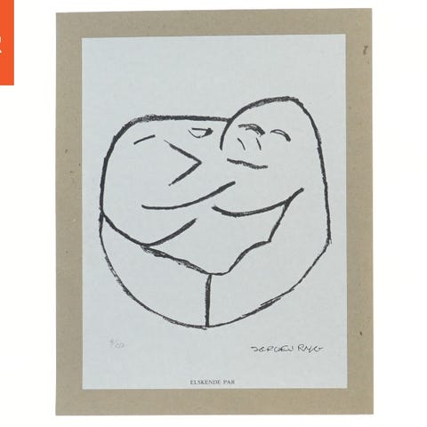 Sort-hvid kunsttryk af skuespilleren Jørgen Ryg med en abstrakt tegning af et par i30,5x24 cm. Papiret har en beige kant og er signeret. Nedenunder er titlen 'ELSKENDE PAR' trykt.