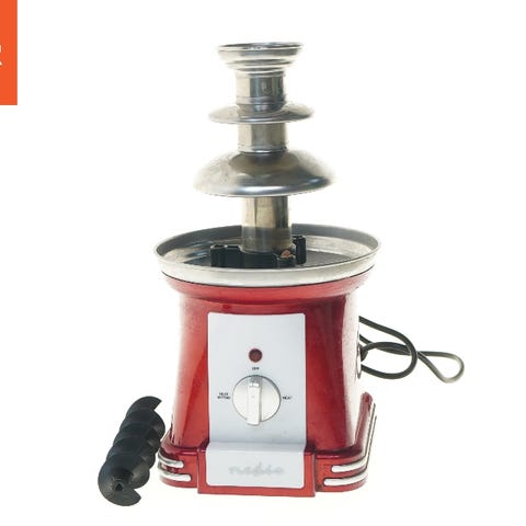 En mini chokoladefontæne med elektrisk tilslutning, beregnet til at smelte og hælde chokolade over desserter eller frugt. Sættet inkluderer flere aftagelige dele, som en centrumskrue og ekstra tilbehør, der hjælper med chokoladeflowet. Størrelsen er 13x15 cm.
