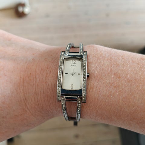 Smykkeur, Guess, Fantastisk flot Guess ur med flot Skive i guld farve. Ældre model, købt som samle objekt og ligget i skuffe i flere år. Skal have batteri. Lækker blød læderrem inden i/ lak ovenpå. Der følger intet med.