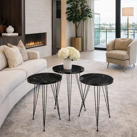 Stilfuldt sæt af tre sideborde med elegante sorte marmor-agtige overflader og slanke metalhårnålsben. Overfladen giver et luksuriøst marmorudseende, samtidig med at den er let og praktisk til hverdagsbrug. Et moderne, pladsbesparende design, der fungerer smukt sammen som et sæt eller hver for sig i ethvert nutidigt interiør.