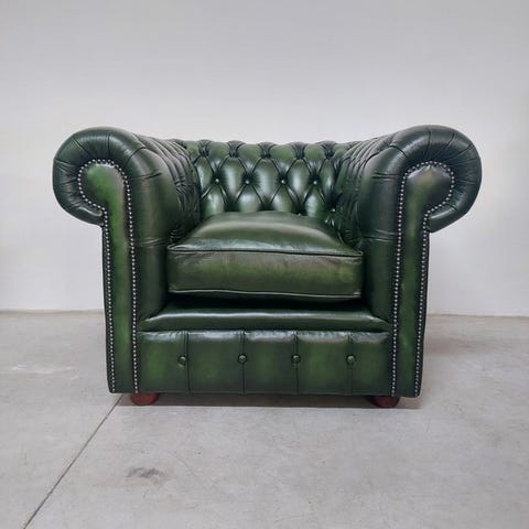 Dyb knapning i ryggen og de runde armlæn er fuldt polstret i læder, også bagsiden, hvilket gør
