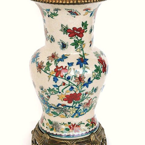 Denne smukke, elegante vase af porcelæn pryder et kunstnerisk håndmalet dekor i emalje. Et dekor bestående af filigrane ranker og blomster, vævet ind i det fine gyldne lykkens tegn, omkredser vasen. Gyldne skinnende håndtag! Et objekt, hvor samlingen virkelig kan betale sig! Vasen fik en let patina, hvilket gør den endnu kostbarere. Farverne kan variere en smule afhængigt af belysning og skærm.