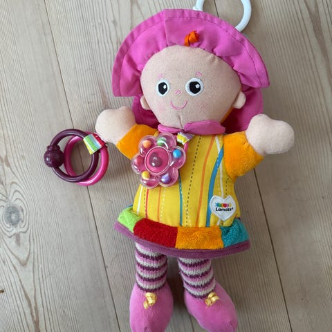 dukke My friend Emily, Lamaze, aktivitetslegetøj, sød dukke, gul kjole. Lavet i forskellige strukturer, der er sjovt for barnet at udforske og røre ved. Skørtet og fødderne knitrer når de berøres, halskæden rasler, hvid plastring i toppen, så den let kan hænges op f.eks. på barnevognen. Dukkens strukturer, mønstre, lyde og former er med til at udvikle barnets sanser. H: 34 cm. Emily er MEGET VELHOLDT, kommer fra IKKE RYGER hjem. Sælges for 35 kr. Sender gerne.IKKE MED FIKS FÆRDIG Porto oveni