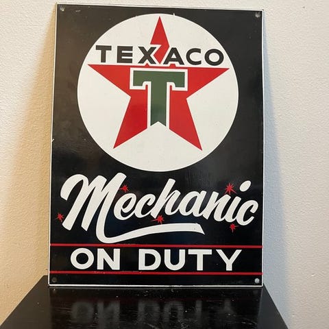 Den bløde blå baggrund og de varme farver på dåsen med motorolie gør dette skilt til et rigtigt blikfang i garage, mancave, værksted eller en samling af automobilia og vintage