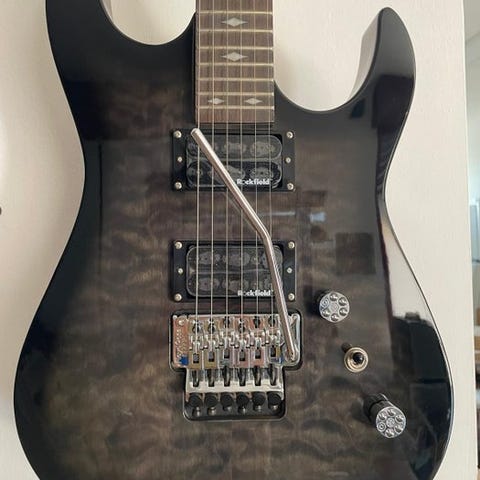 Den har et popler-korpus, en ahorn-krone? neck and 22-fret fingerboard made of Laurel.