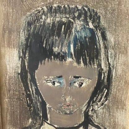 Oljemaleri på lærred, der forestiller et elegant kvindeligt portræt med en moderne og ekspressiv enstilling. Værket har en nødvendig og stærkt karakterfuld komposition: ansigtet, stiliseret og svævende på en neutral baggrund, er opbygget med frie penselstrøg og kølige farver i grå og blå nuancer.