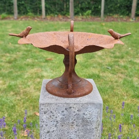 Et rustikt metalfuglebad/både til foder med stander, med en lille fugl på skålen, 74 cm høj, 42 cm bred og 42 cm dyb, oprindelse Europa, dateret fra 2020 eller senere, i særdeles ny stand. Klik på den blå "gå til varen" knap, for at købe eller byde på denne vare. Den samlede pris vil blive vist inden du afgiver dit bud.