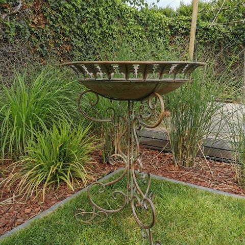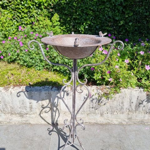 Et meget dekorativt jern- og metalfuglebad i form af en skål med to tilhørende fugle. Rustpatina. De mål er som følger (+/-):