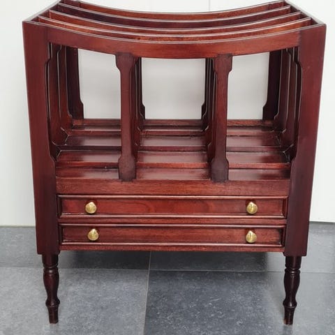 Antikt tidsskriftestativ af eg fra Canterbury, Storbritannien, dateret 1940–1950, målene 59 × 39 × 29 cm, vægt 3 kg, med tre taps, drejede spiler og runde mellemholdere. Klik på den blå "gå til varen" knap, for at købe eller byde på denne vare. Den samlede pris vil blive vist inden du afgiver dit bud.