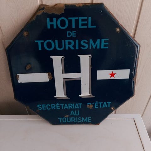 Skiltet er lavet af emaljeret plade.