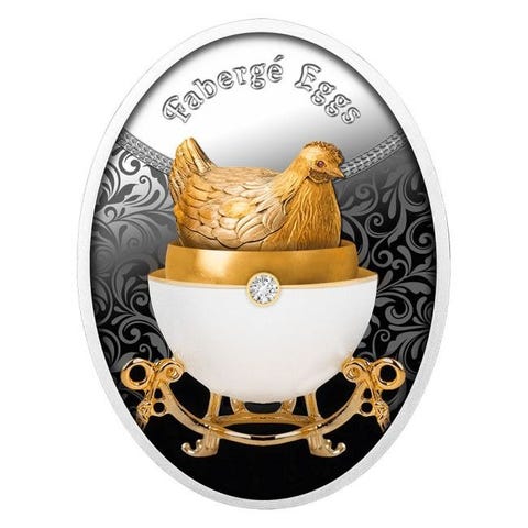 Drømmen for hver samler – symboler på prestige og luksus, som når svimlende priser ved auktioner. Europas konger drømte om produkterne fra det berømte Fabergé-hus. De bedste juvelér-kunstnere, der arbejdede der, lavede kongelige insignier, smykker og frem for alt de legendariske påskeæg. En sølvmønt med en trofast gengivet