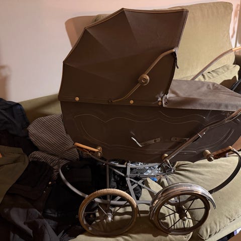 En stor vintage trælegetøjsvogn med metalhjul, der daterer sig til midten af det 20. århundrede (ca. 1940–1950), fremstillet af træ i Europa og i god brugsstand med små tegn på alder og pletter; dimensioner ca. 100 cm lang, 44 cm dyb og 40 cm høj, brun i farven. Klik på den blå "gå til varen" knap, for at købe eller byde på denne vare. Den samlede pris vil blive vist inden du afgiver dit bud.