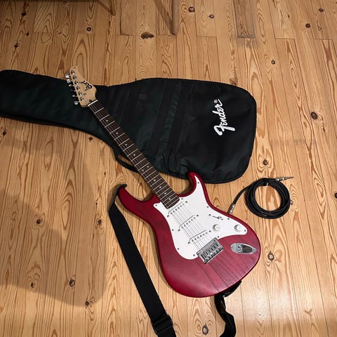 Washburn G-Junior G-JRV el-guitar fra seneste 1980’erne, lavet i Sydkorea, 25,4" scale, ahorn hals og gribareal, HSS pickups, 5-vejs skifte, vægt 3,5 kg, i god fysisk stand og testet og spilbar, inkluderer Tobago gigbag. Klik på den blå "gå til varen" knap, for at købe eller byde på denne vare. Den samlede pris vil blive vist inden du afgiver dit bud.