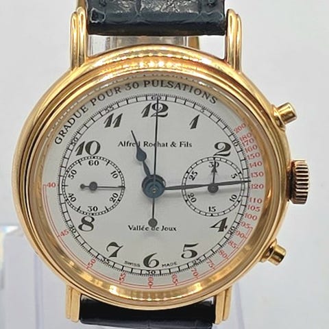 Sølvfarvet urskive. Fin fremtoning i usædvanligt smuk tilstand. Forgyldte arabiske tal 12/2/4/6/8/10 og mellem dem punkt-tal - fortrinsvis sekundemåltider med indlagte arabiske 5-tals tal - 5 til 60. - to ydre løbende skalaer røde og blå. To hjælpe-skiver - ved ni små sekund - ved tre 30-minutters tæller. Guldfarvede pilevisere. Den guldfarvede chronografviser fra midten. Markeret Parker under