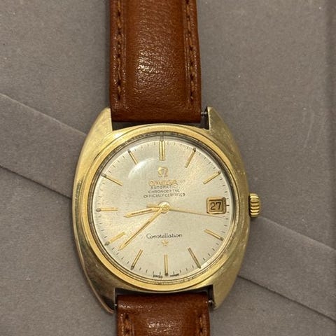 Omega herreur i 18K guld Constellation kronometer automatisk kaliber 561, Schweiz omkring 1963, kasse 34 mm, 24-timers skive med sorte tal, læderstykke; original æske og papirer ikke inkluderet; forsikret forsendelse. Klik på den blå "gå til varen" knap, for at købe eller byde på denne vare. Den samlede pris vil blive vist inden du afgiver dit bud.