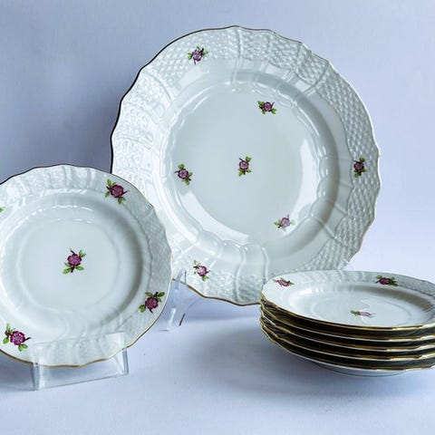 Et elegant Herend porcelæns middagsstel fremstillet i 1940’erne, dekoreret med små grønne ensfarvede blomstermotiver.