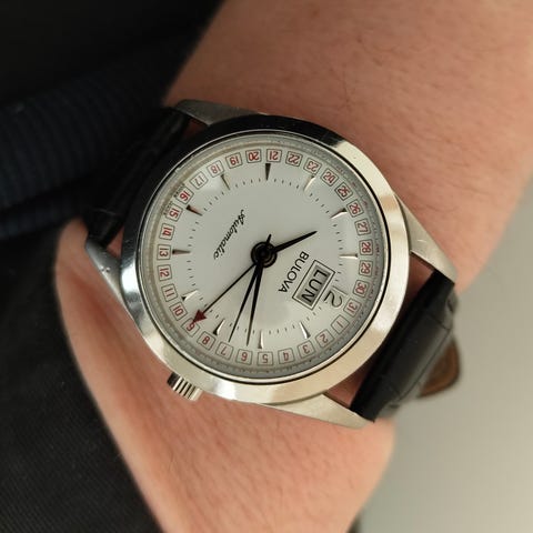 Sekundviseren er rødorange, og timeviserne er hvide og lystende; krystallen buer, markeringsindexerne er hvide og der er et Bulova Accutron-logo, sjældent i denne konfiguration.