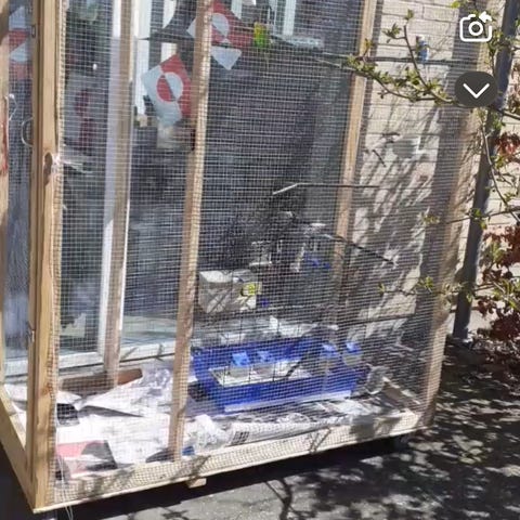 Udendørs voliere til undulater i metal. Volieren er opbygget med faste sider og netsektion samt fast tag.