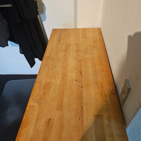 Rullebord med træbordplade og to metalhylder. Har fungeret som ekstra køkkenbord.
