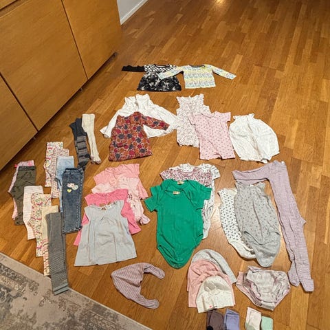 H&M pigetøj pakke i str. 92 i multifarvede nuancer. Pakken indeholder forskellige typer tøj til pige, blandt andet bluser, bukser, kjoler, bodyer, strømpebukser og undertøj, som ses på billederne. Tøjet er egnet til hverdag og brug i institution, og farver og motiver varierer mellem lyse og mørke toner samt enkelte tryk med figurer. Alle dele er i samme størrelsesgruppe omkring str. 92.