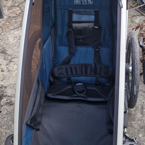 Din plads til to eller god plads til én og en masser oppakning. Fint bagagerum. Der medfølger hjul til gåvogn/løbevogn og der er også en til at montere på cykel. Jeg har vist også et beslag til cykel liggende et sted der kan følge med.