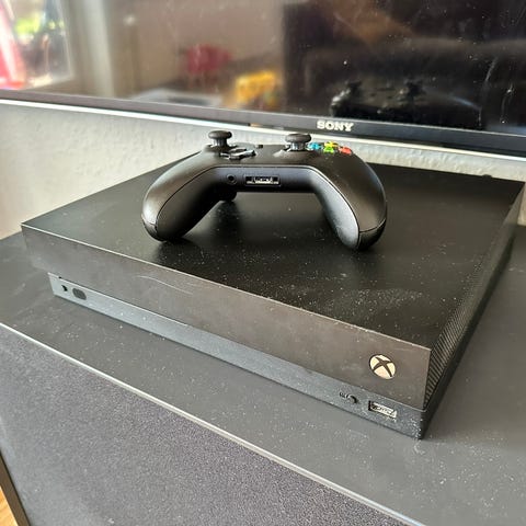 Xbox one X, god stand, 3 spil, controller og ledninger medfølger