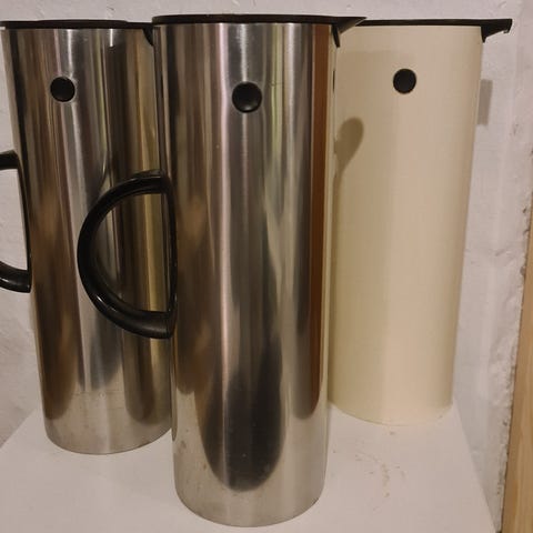 Stelton termokande i hvid med sort låg. Klassisk cylindrisk design med hank i siden og udskifteligt låg. Der medfølger både det smarte vippelåg og et klassisk skruelåg