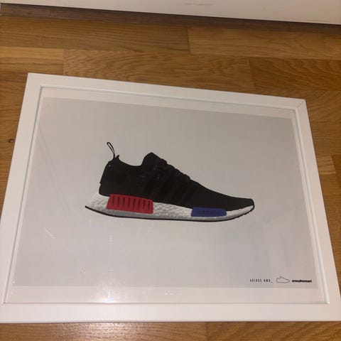 Plakat med motiv af en mørk sneaker, indrammet i en lys ramme. Egnet som vægdekoration i f.eks. stue, gang eller værelse. Billedet viser skoen på lys baggrund, og rammen har en enkel, moderne stil.