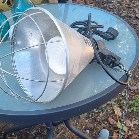I flot stand med lang ledning, der er net indeni så kyllingerne ikke kommer i kontakt med pæren. Kontakt 21463052