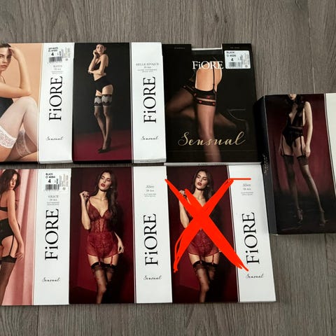 4 par helt nye Fiore stockings / hold-ups / selvsiddende nylonstrømper i str. 3 - svarer til str. M, tjek størrelsesangivelse på billederne.- uåbnet emballage.